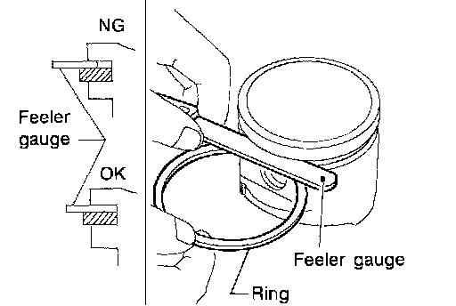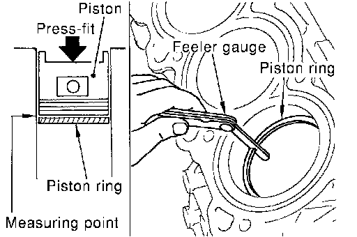 ^ Lubricate with new engine oil to piston and piston ring, and then insert piston ring until middle of cylinder with piston, and measure the piston ring end gap with feeler gauge.