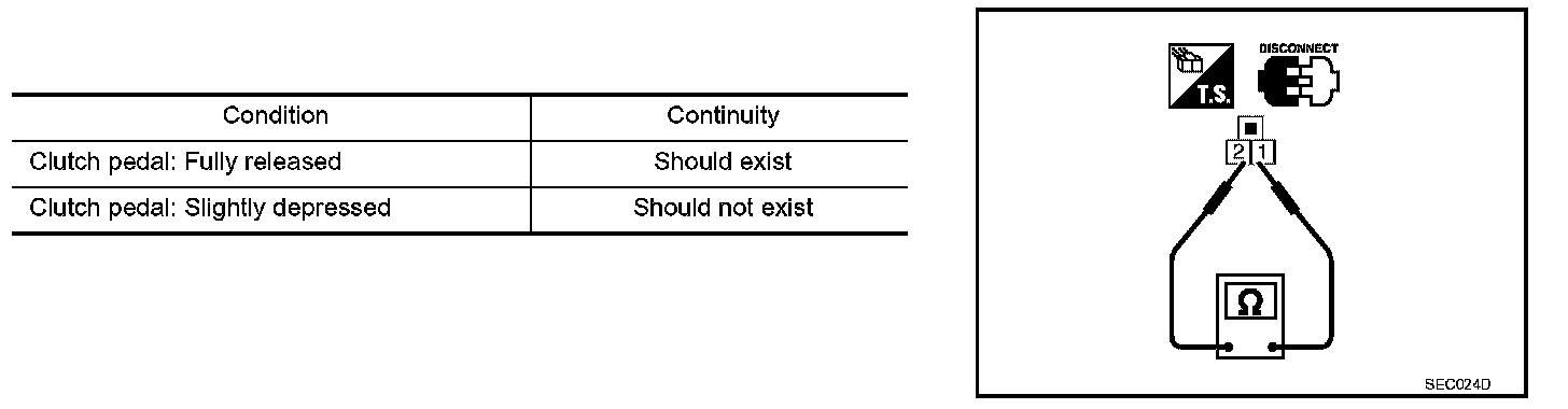 3. Check continuity between ASCD clutch switch terminals 1 and 2 under the given conditions.