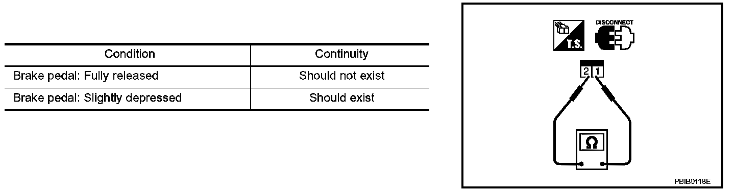 3. Check continuity between ASCD brake switch terminals 1 and 2 under the following conditions.