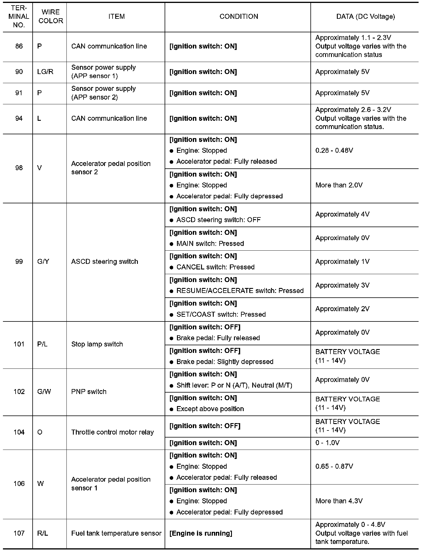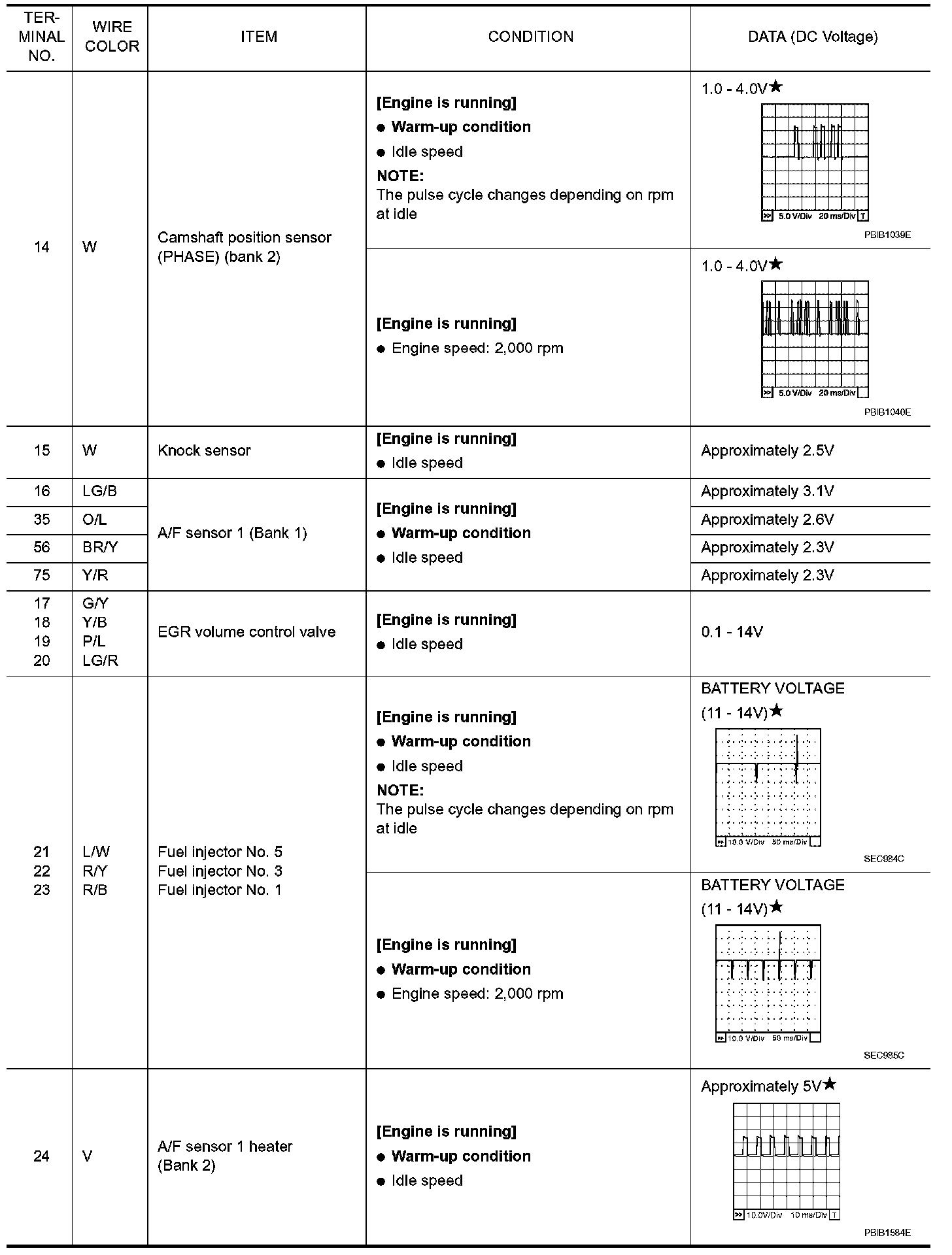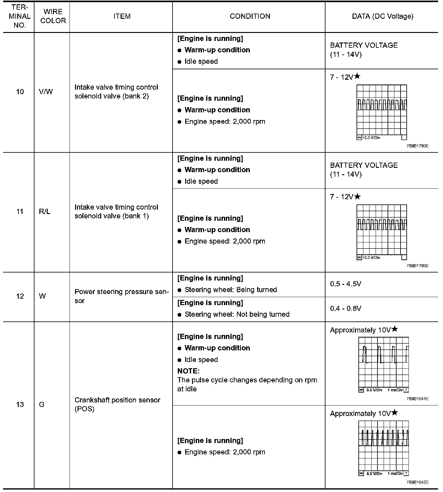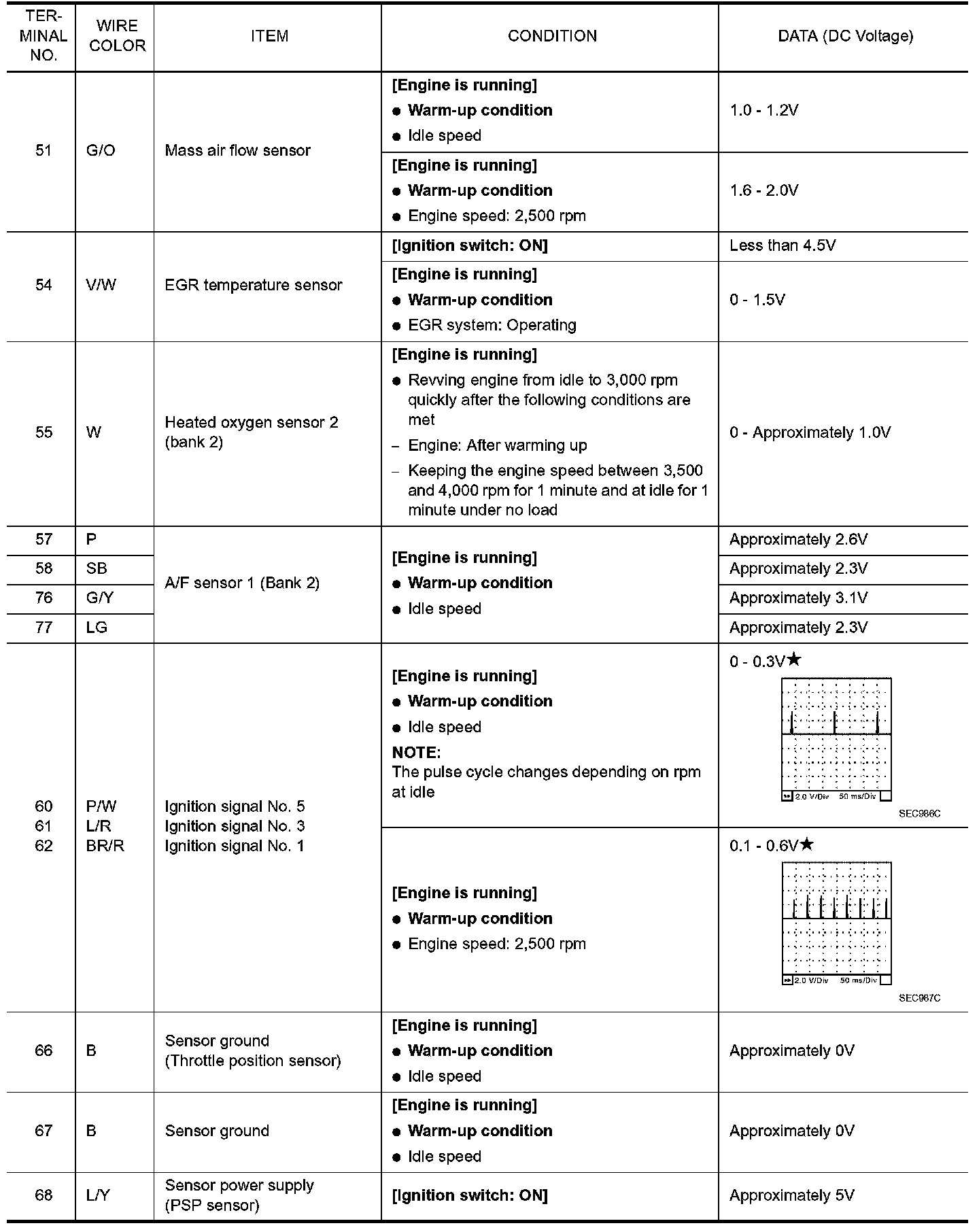 Specification data are reference values and are measured between each terminal and ground. Pulse signal is measured by CONSULT-II.