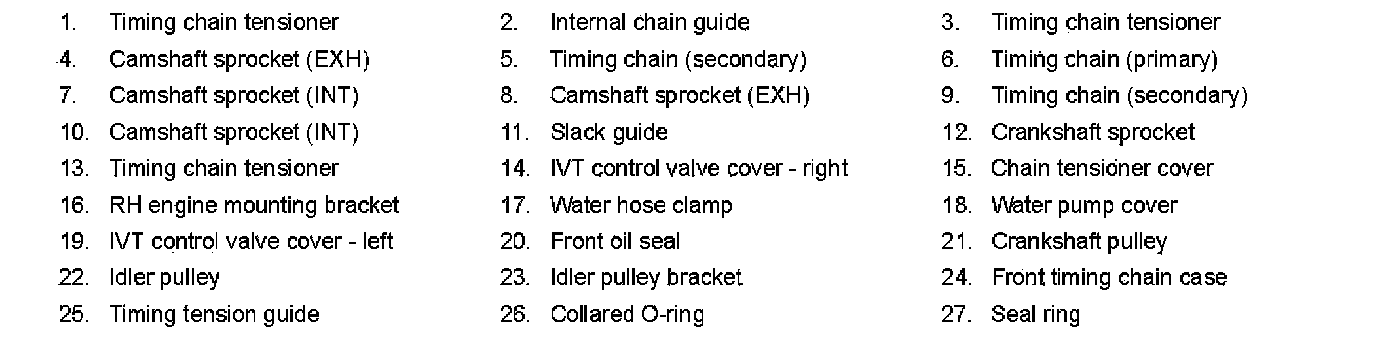 ^ This section describes procedures for removal/installation procedure of the front timing chain case and timing chain related parts without removing the oil pan (upper) from the vehicle.