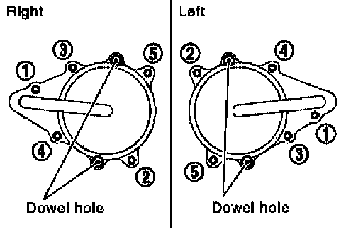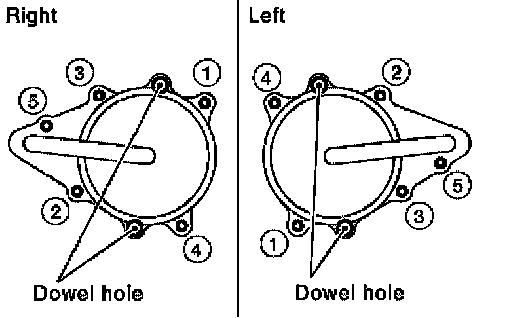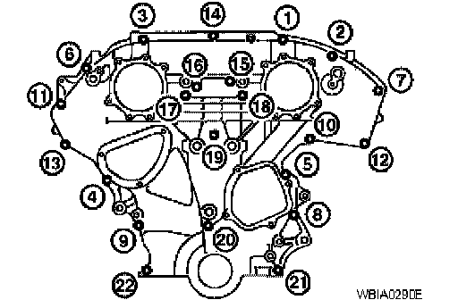 ^ Retighten the front timing chain case bolts in the order as shown.