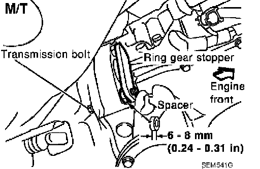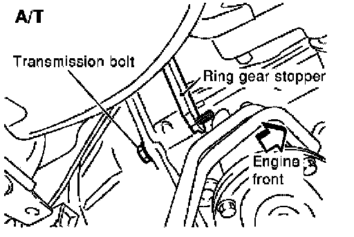 27. Lock the drive plate (A/T), flywheel (M/T) using Tool attached to the starter bolt hole in the transaxle.