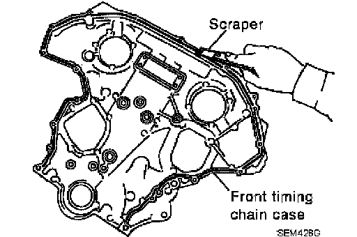 32. Use a scraper to remove all of the old Silicone RTV Sealant from the front timing chain case and opposite mating surfaces.