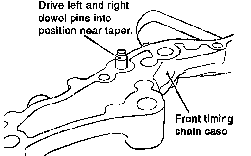 1. Install dowel pins (right and left) into front timing chain case up to a point close to taper in order to shorten protrusion length.