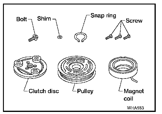When replacing compressor clutch assembly, always conduct the break-in operation. This is done by engaging and disengaging the clutch about 30 times. Break-in operation raises the level of transmitted torque.