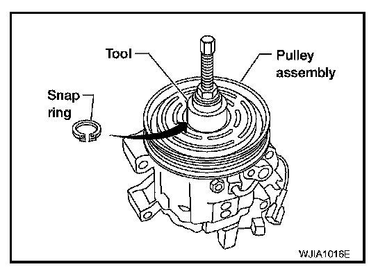 3. Install the pulley assembly using Tool and a wrench, and then install the snap ring using snap ring pliers.