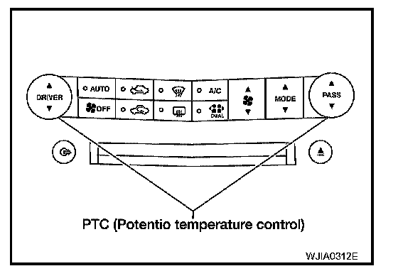 The PTC is built into the A/C switch. It can be set at an interval of 0.5 degrees C (1.0 degrees F) in the 16 degrees C (60 degrees F) to 32 degrees C (90 degrees F) temperature range by pressing the temperature switch. The set temperature is displayed.