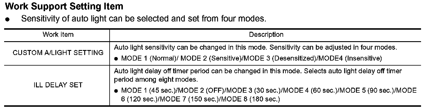 3. Touch "CUSTOM A/LIGHT SETTING" or "ILL DELAY SET" on "SELECT WORK ITEM" screen.