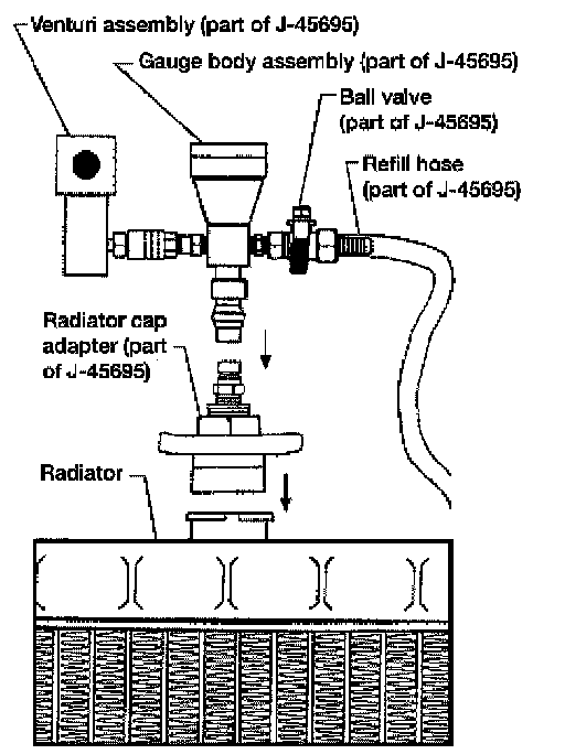 4. Install the Tool by installing the radiator cap adapter onto the radiator neck opening. Then attach the gauge body assembly with the refill tube and the venturi assembly to the radiator cap adapter.