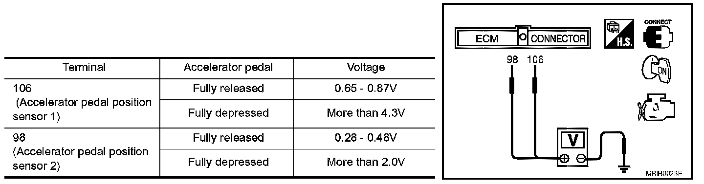3. Check voltage between ECM terminals 106 (APP sensor 1 signal), 98 (APP sensor 2 signal) and ground under the given conditions.