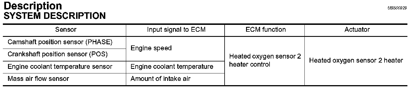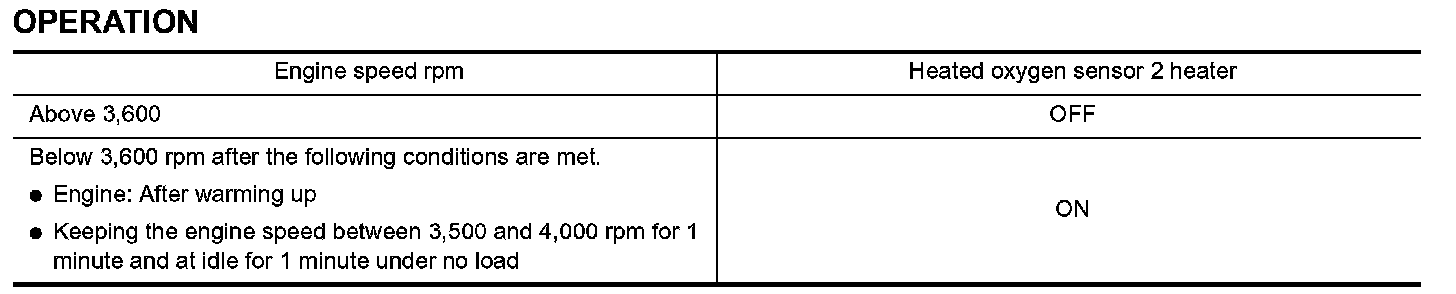 The ECM performs ON/OFF control of the heated oxygen sensor 2 heater corresponding to the engine speed, amount of intake air and engine coolant temperature.
