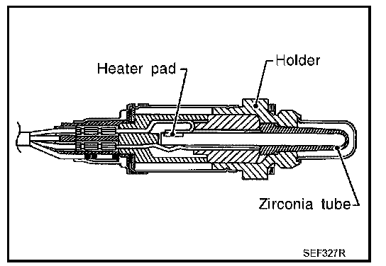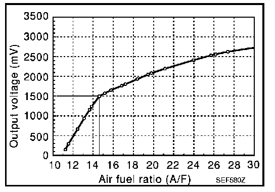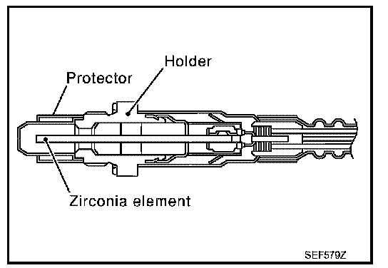 The heated oxygen sensor 2, after three way catalyst (manifold), monitors the oxygen level in the exhaust gas on each bank. Even if switching characteristics of the A/F sensor 1 are shifted, the air-fuel ratio is controlled to stoichiometric, by the signal from the heated oxygen sensor 2. This sensor is made of ceramic zirconia. The zirconia generates voltage from approximately 1 V in richer conditions to 0 V in leaner conditions.