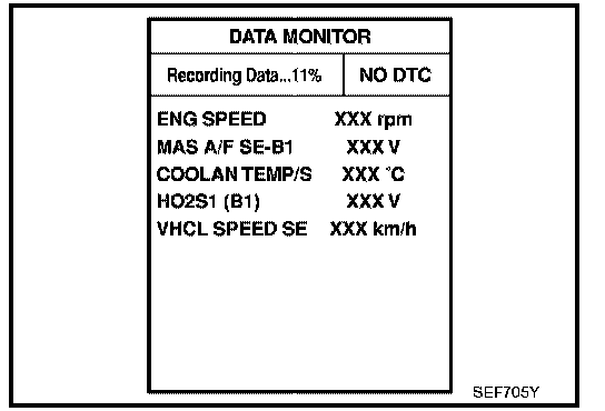 In other words, DTC/1st trip DTC and malfunction item will be displayed if the malfunction is detected by ECM. At the moment a malfunction is detected by ECM, "MONITOR" in "DATA MONITOR" screen is changed to "Recording Data ... xx%" as shown in the figure, and the data after the malfunction detection is recorded. Then when the percentage reached 100%, "REAL-TIME DIAG" screen is displayed. If "STOP" is touched on the screen during "Recording Data ... xx%", "REAL-TIME DIAG" screen is also displayed.