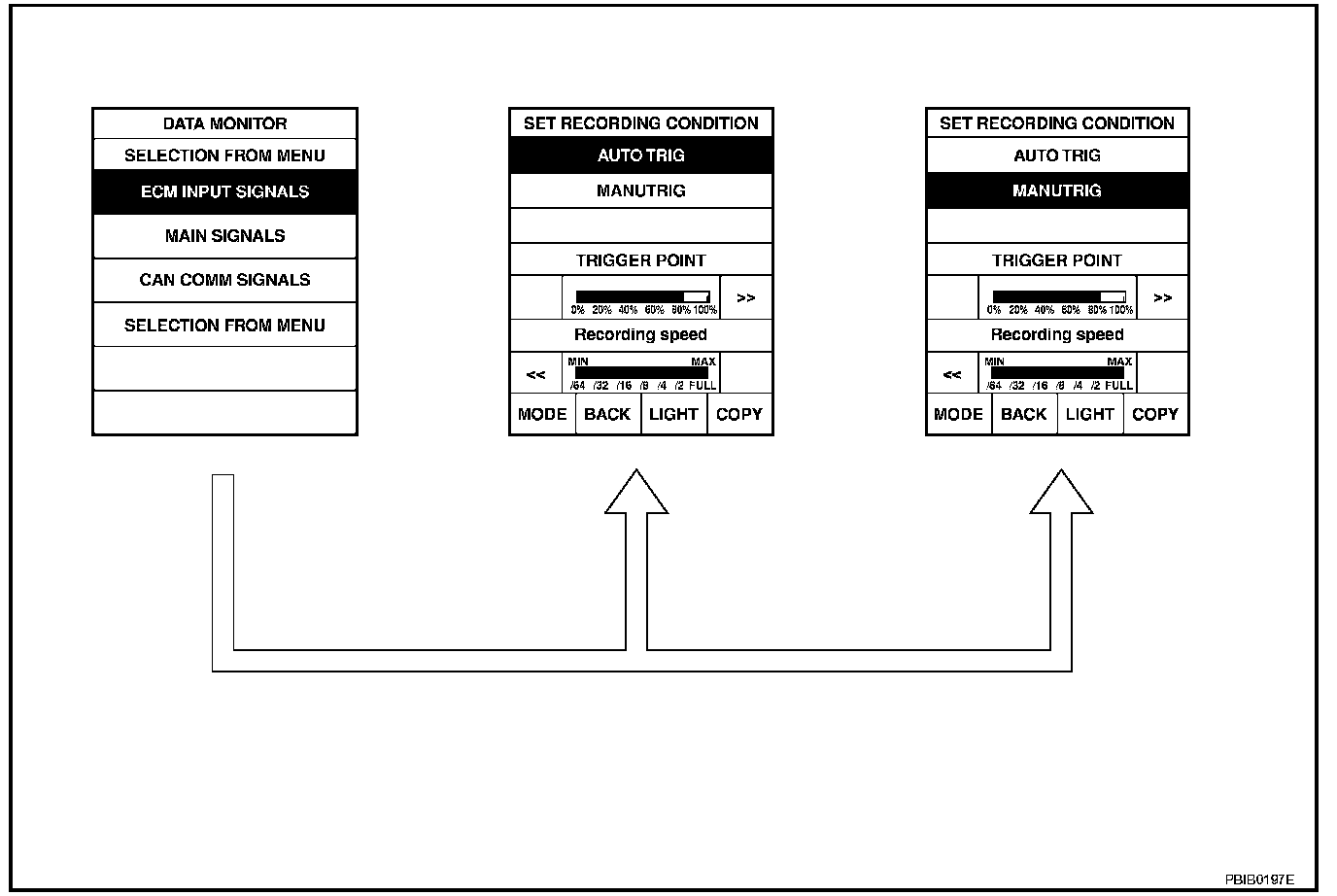 The recording time after the malfunction detection and the recording speed can be changed by "TRIGGER POINT" and "Recording Speed". Refer to CONSULT-II OPERATION MANUAL.