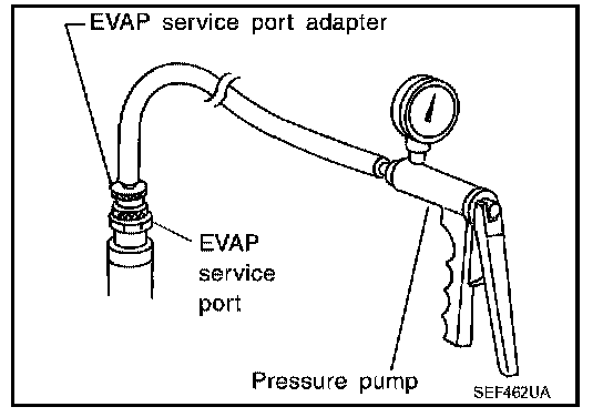 Positive pressure is delivered to the EVAP system through the EVAP service port. If fuel vapor leakage in the EVAP system occurs, use a leak detector to locate the leak.