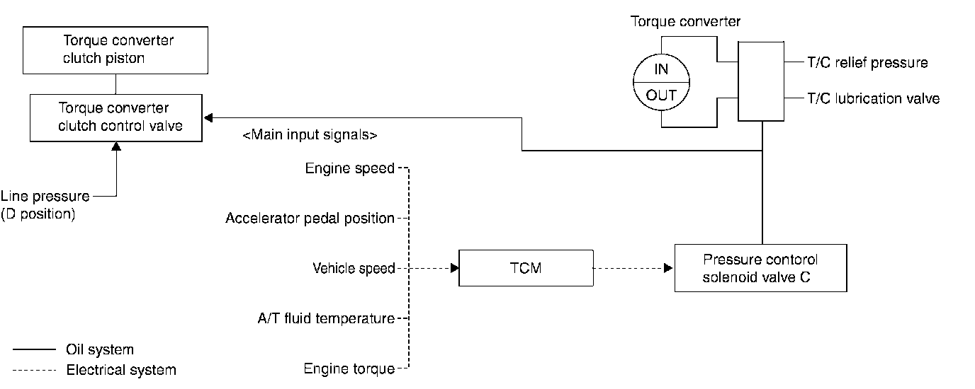 The torque converter clutch piston in the torque converter is engaged to eliminate torque converter slip to increase power transmission efficiency The torque converter clutch control valve operation is controlled by the pressure control solenoid valve C, which is controlled by a signal from TCM, and the torque converter clutch control valve engages or releases the torque converter clutch piston.