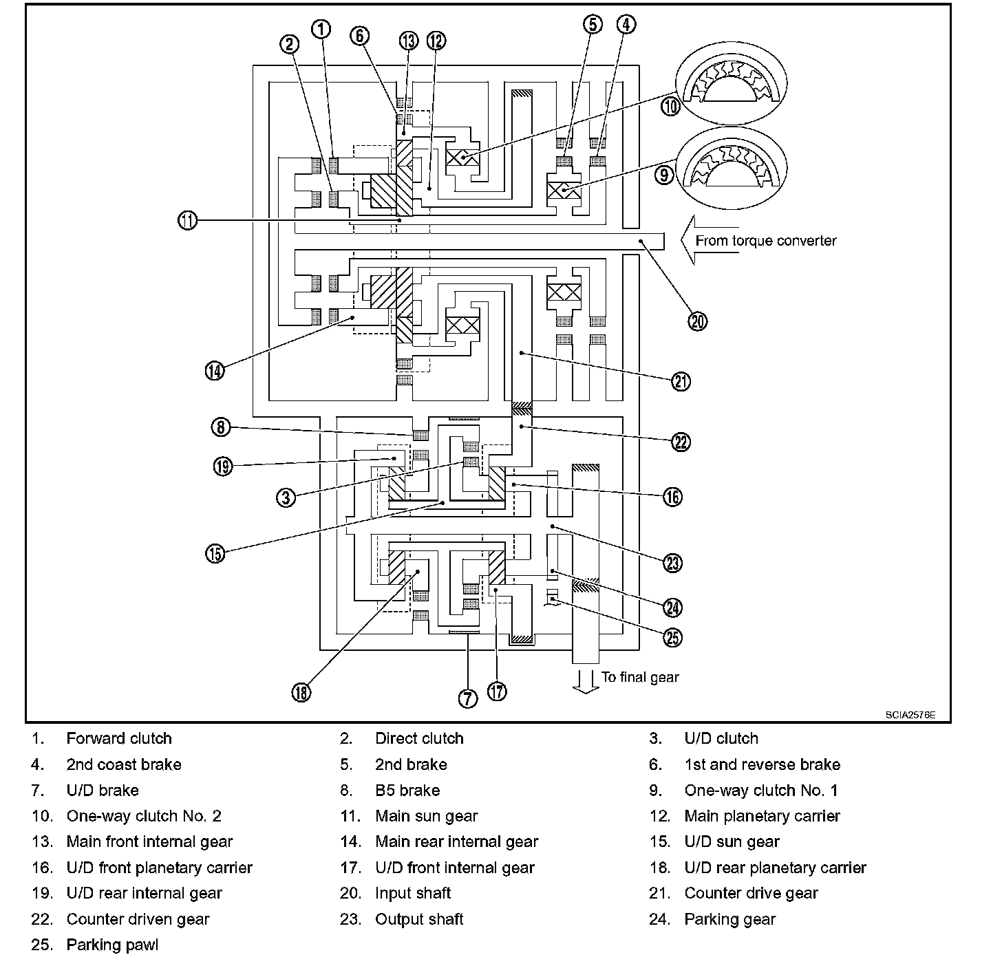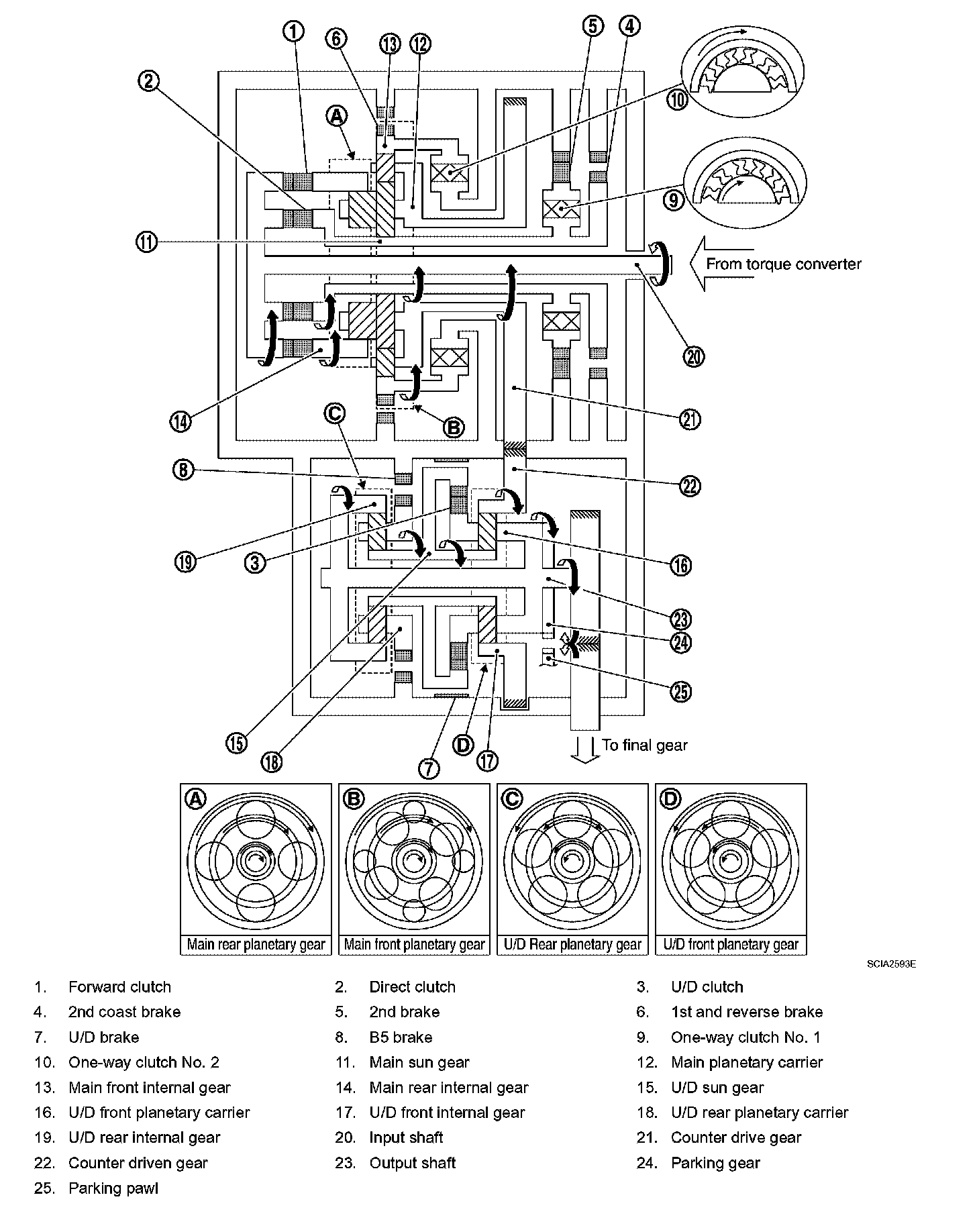^ During deceleration, main front internal gear clockwise due to rotation itself clockwise of main front small planetary pinion gear, but driving force loses due to free of one-way clutch No. 2. Therefore, engine brake does not operate.