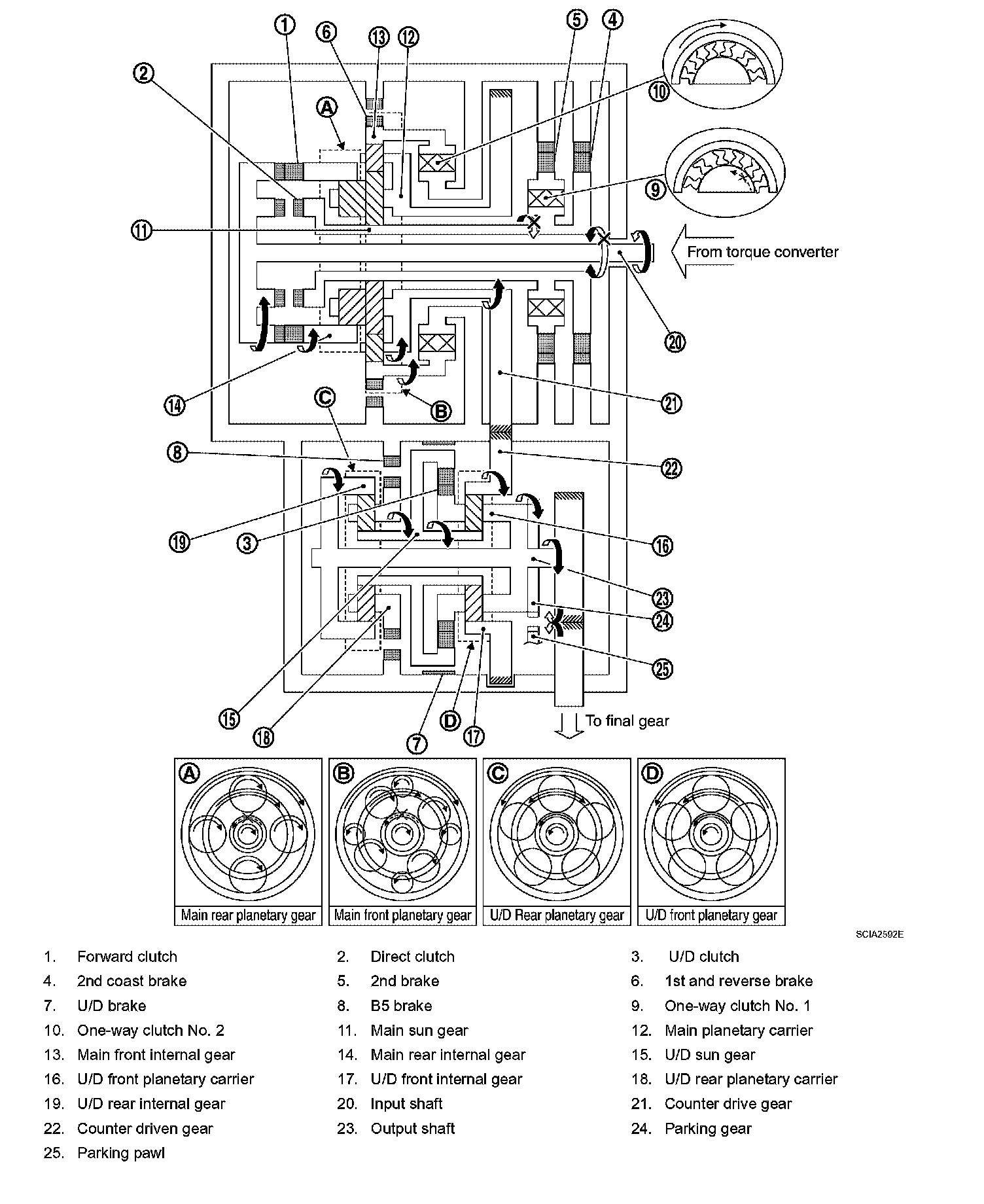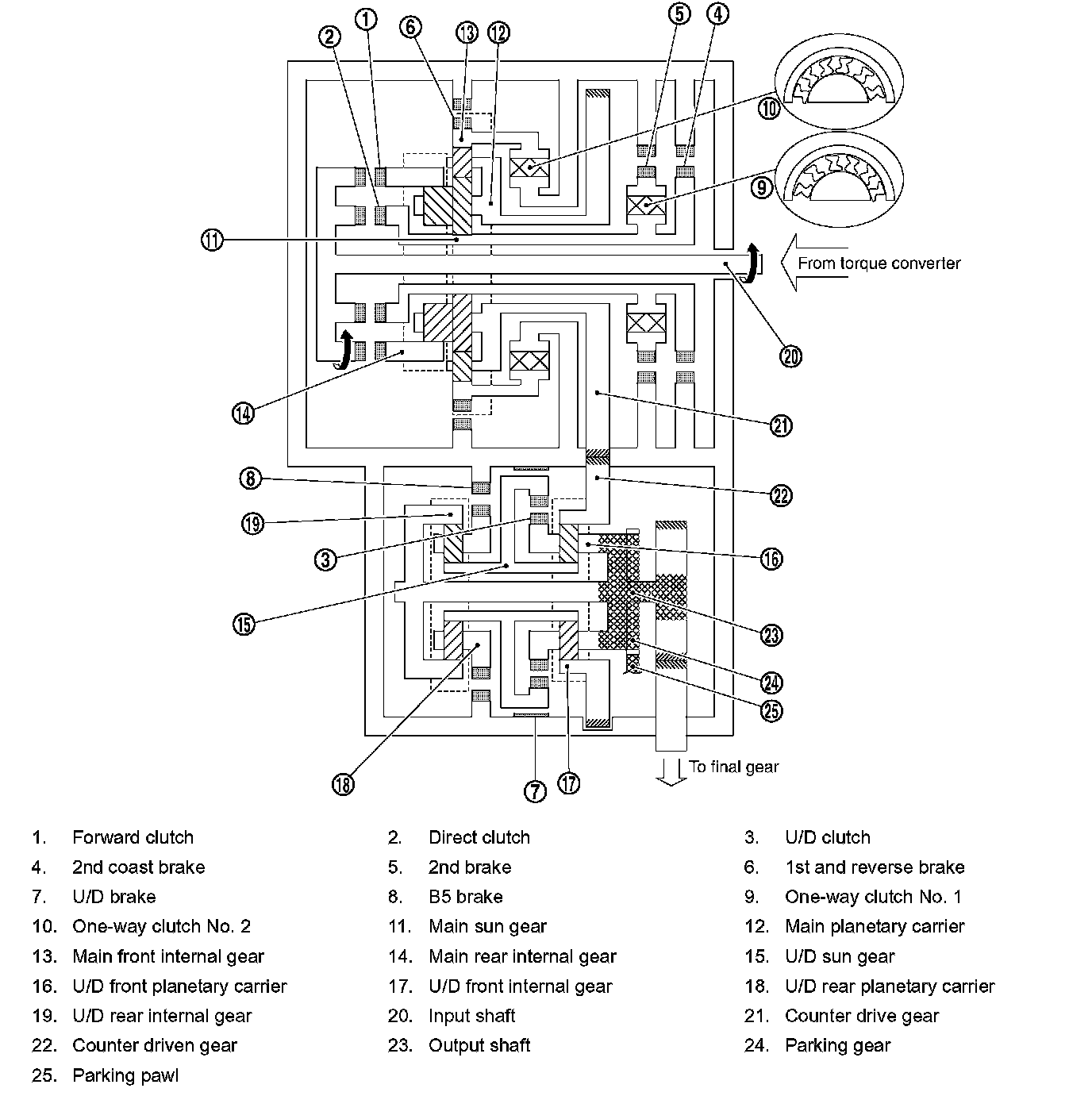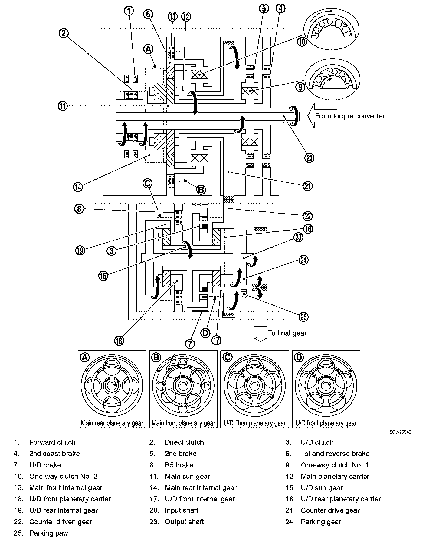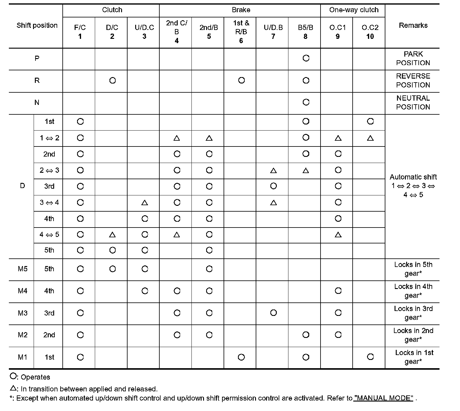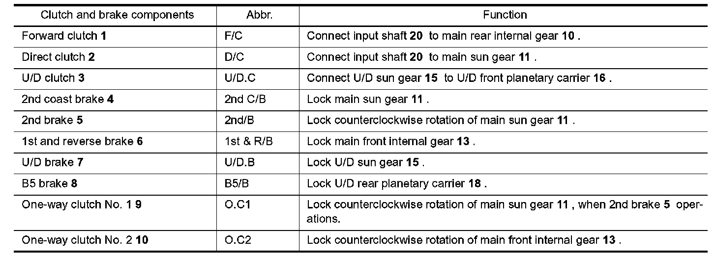 ^ The same as for the "N" position, both the forward clutch and the direct clutch are released, so torque from the input shaft drive is not transmitted to the output shaft.