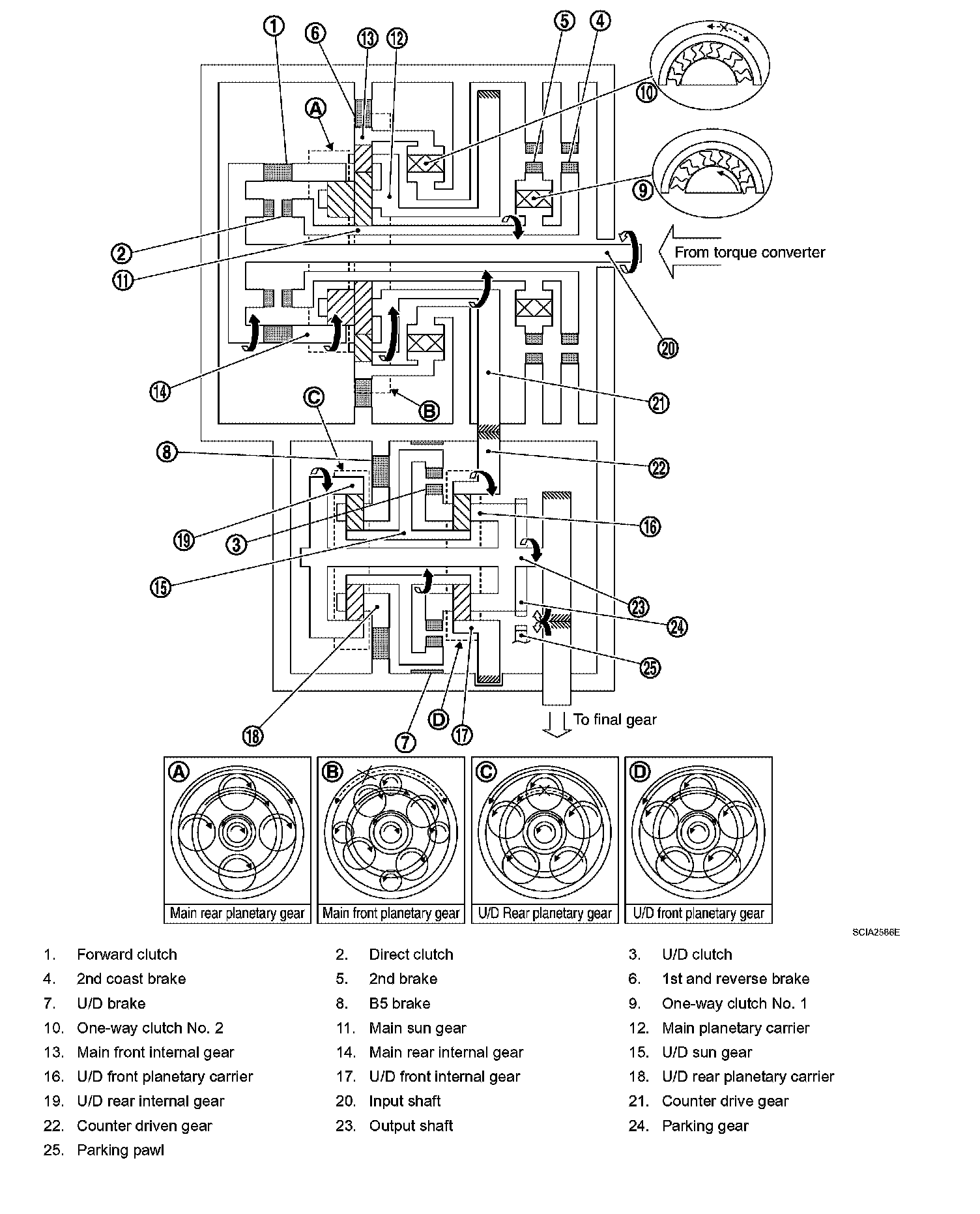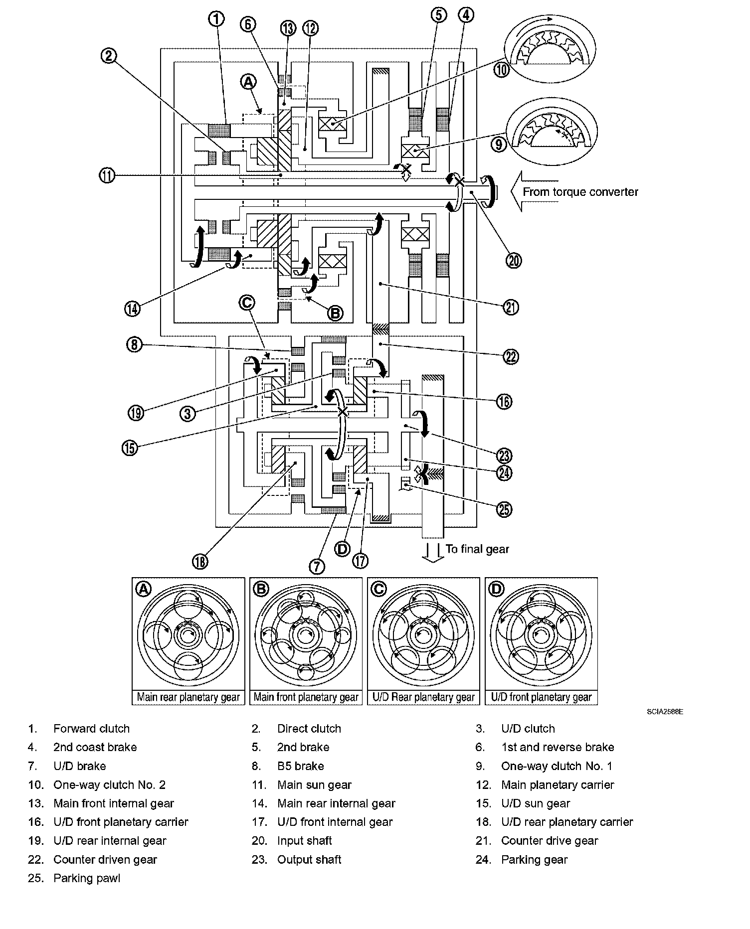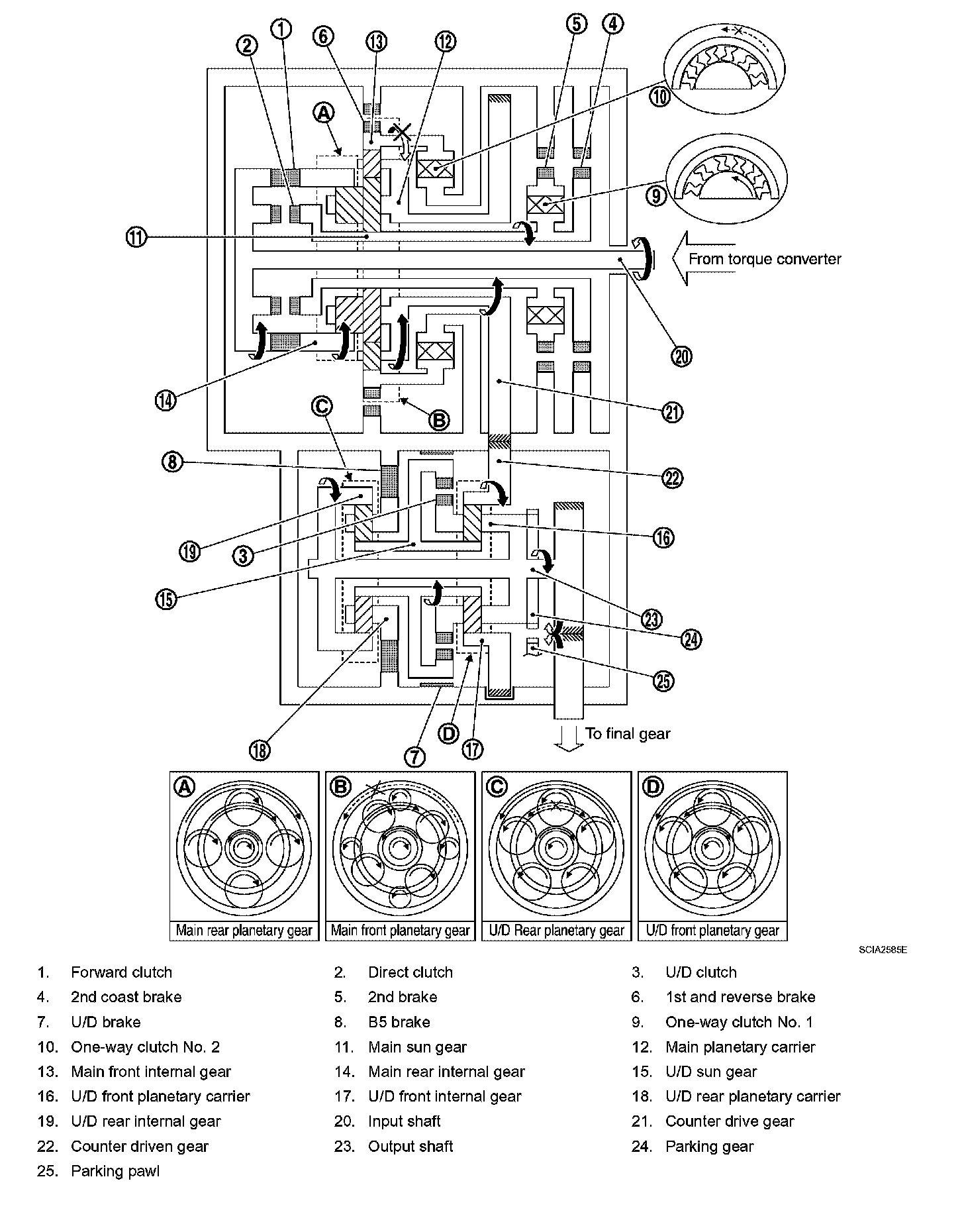 10. U/D front planetary pinion gear cannot rotate itself, and U/D unit rotates counterclockwise as one.