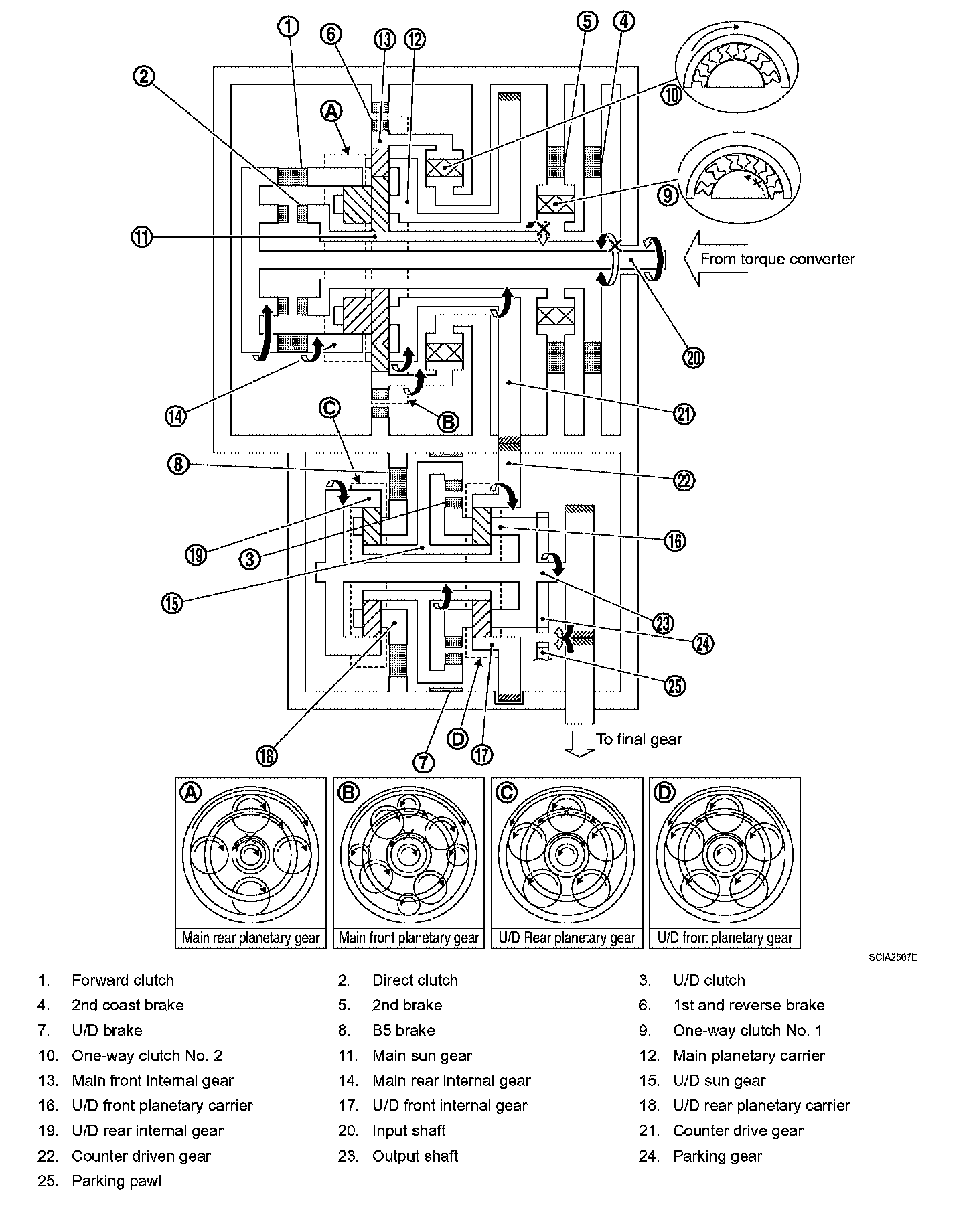 14. U/D front planetary carrier revolves counterclockwise due to reaction force of U/D front planetary pinion gear.