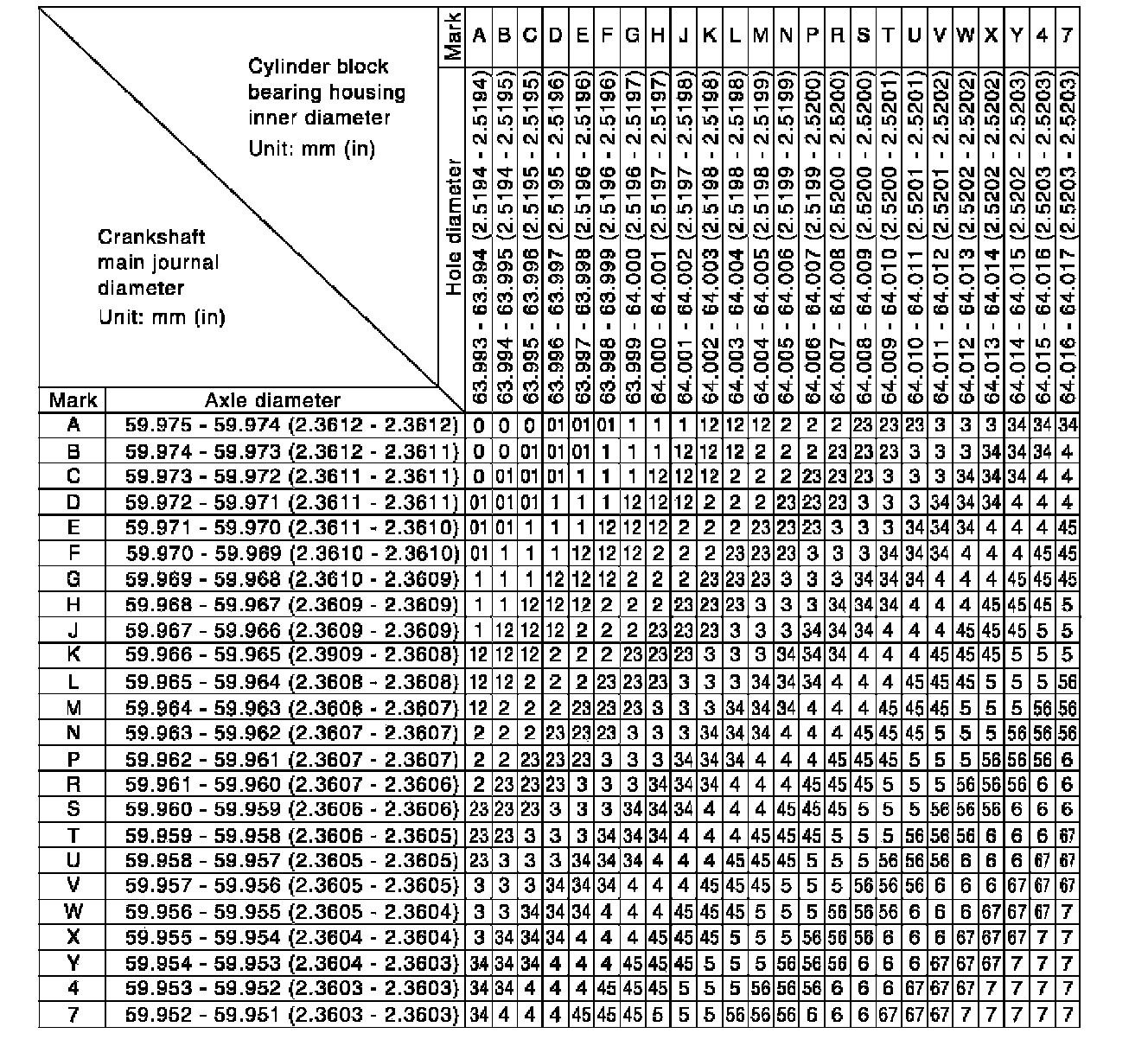 a. The grade number of each cylinder block main journal is punched on the respective cylinder block. These numbers are punched in either Arabic or Roman numerals. If measured diameter is out of the grade punched, decide suitable grade from available main bearings.