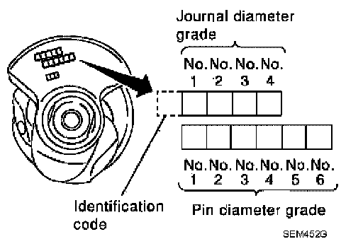 b. The grade number of each crankshaft main journal is punched on the crankshaft end. These numbers are punched in either Arabic or Roman numerals. If measured diameter is out of grade punched, decide the suitable grade from available main bearings.