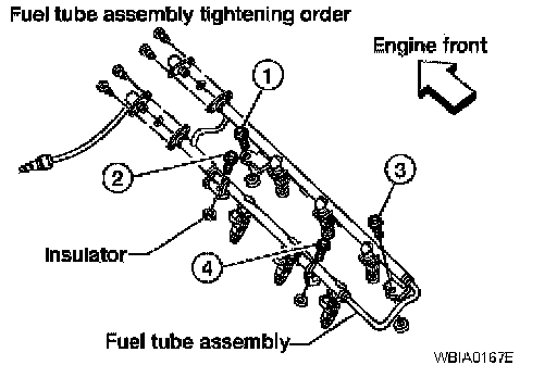 ^ Seat the fuel injectors into the intake manifold with new O-rings. Tighten the fuel rail bolts as shown, in two stages: