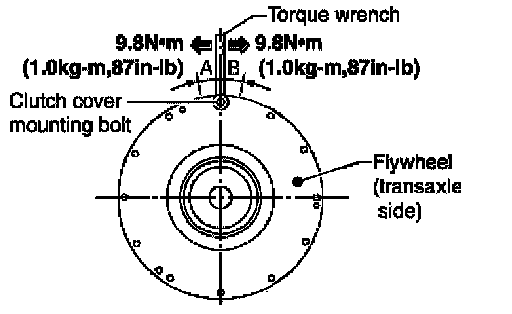 1. Install a bolt to clutch cover mounting hole and place a torque wrench on the extended line of the flywheel center line.