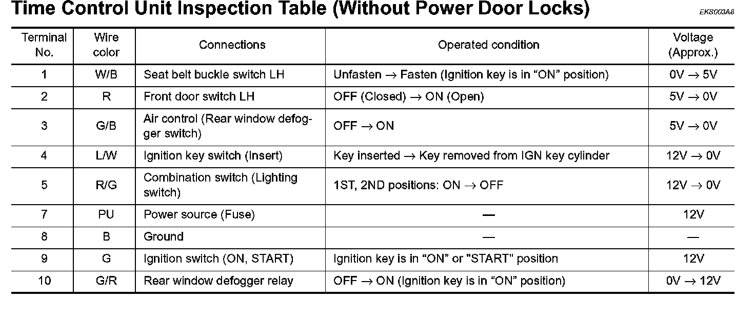 Time Control Unit Inspection Table (Witout Power Door Locks):