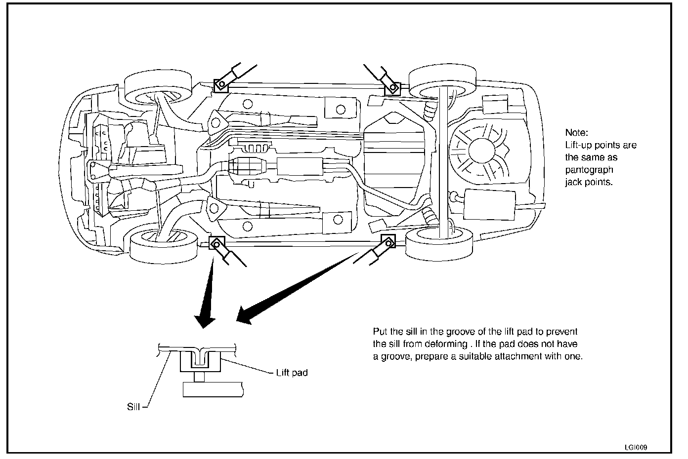 When setting the lift arm, do not allow the arm to contact the brake tubes, brake cable, fuel lines and sill spoiler.
