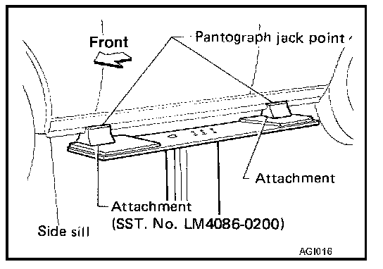 - The board-on lift attachment (LM4086-0200) set at front end of vehicle should be set on the front of the sill under the front door opening.