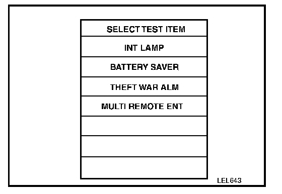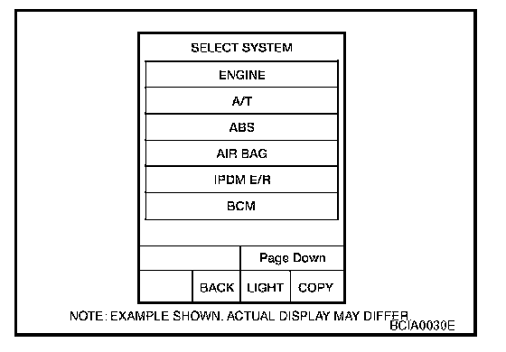 6. Perform each diagnostic item according to "DIAGNOSTIC ITEMS APPLICATION". Refer to BCS-5, "DIAGNOSTIC ITEMS APPLICATION". Scan Tool Testing and Procedures