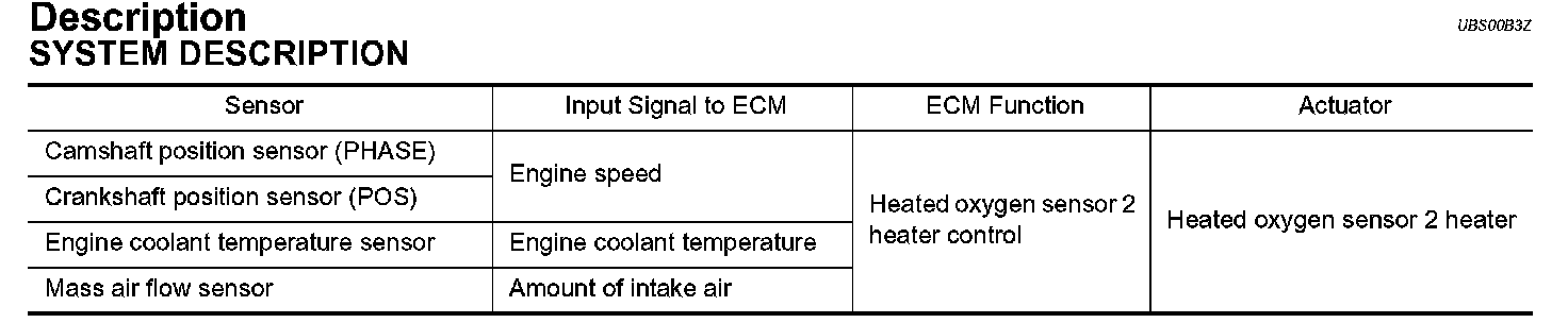 The ECM performs ON/OFF control of the heated oxygen sensor 2 heater corresponding to the engine speed, amount of intake air and engine coolant temperature.