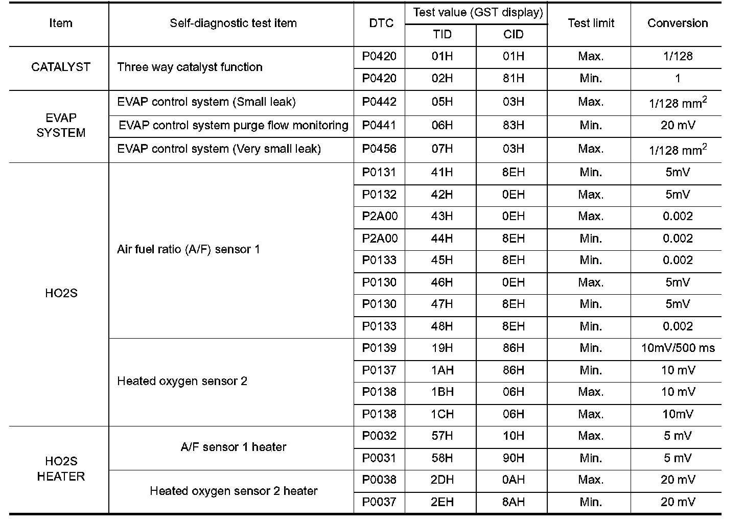 TEST VALUE AND TEST LIMIT (GST ONLY - NOT APPLICABLE TO CONSULT-II)The following is the information specified in Service $06 of SAE J1979.