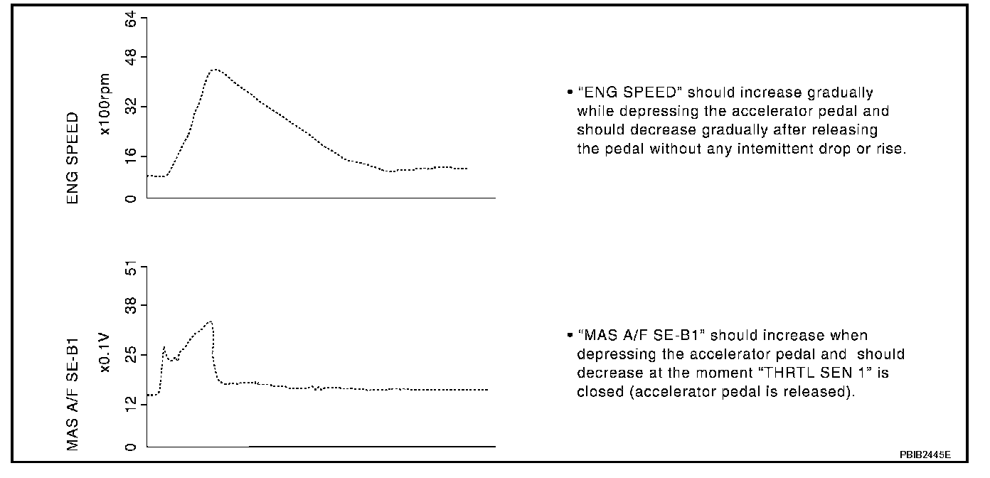 The signal of "ACCEL SEN 1" and "THRTL SEN 1" should rise gradually without any intermittent drop or rise after "CLSD THL POS" is changed from ON to OFF.