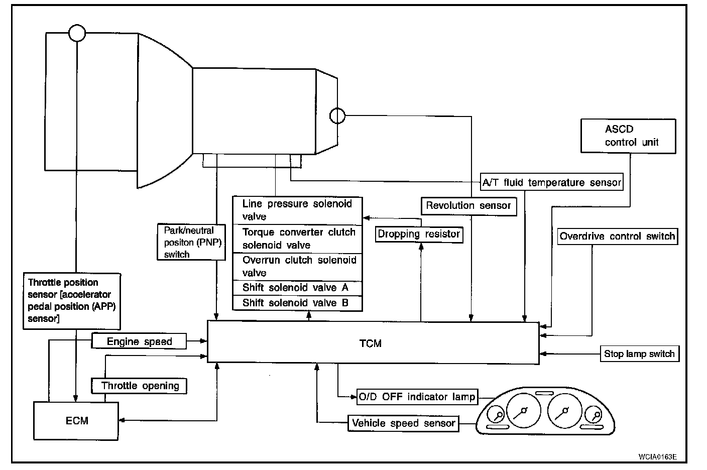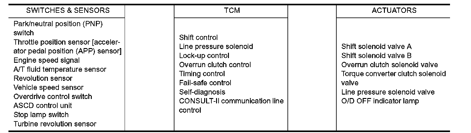 The automatic transaxle senses vehicle operating conditions through various switches and sensors. It always controls the optimum shift position and reduces shifting and lock-up shocks.