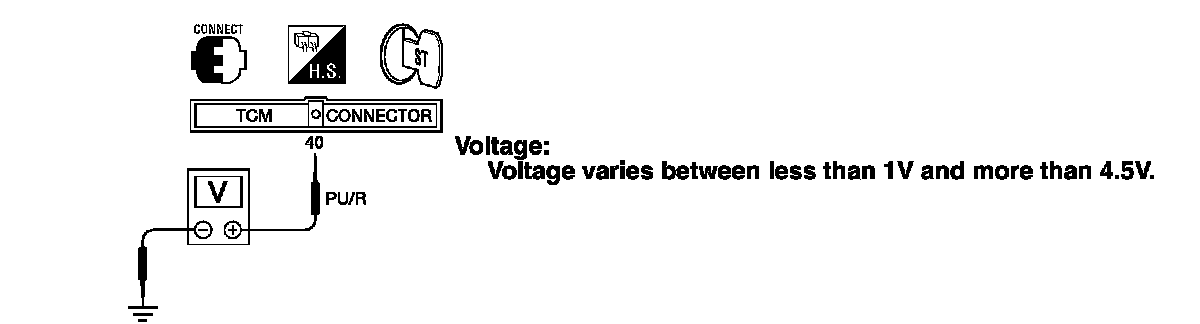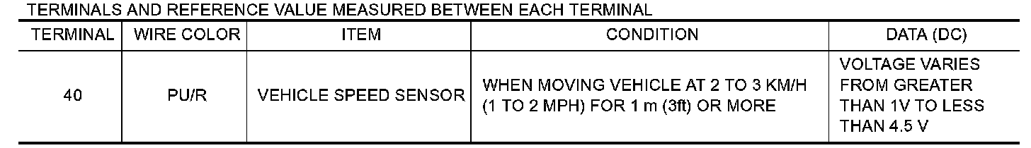 2. Check voltage between TCM terminal 40 and ground while driving at 2 to 3 km/h (1 to 2 MPH) for 1 m (3 ft) or more.