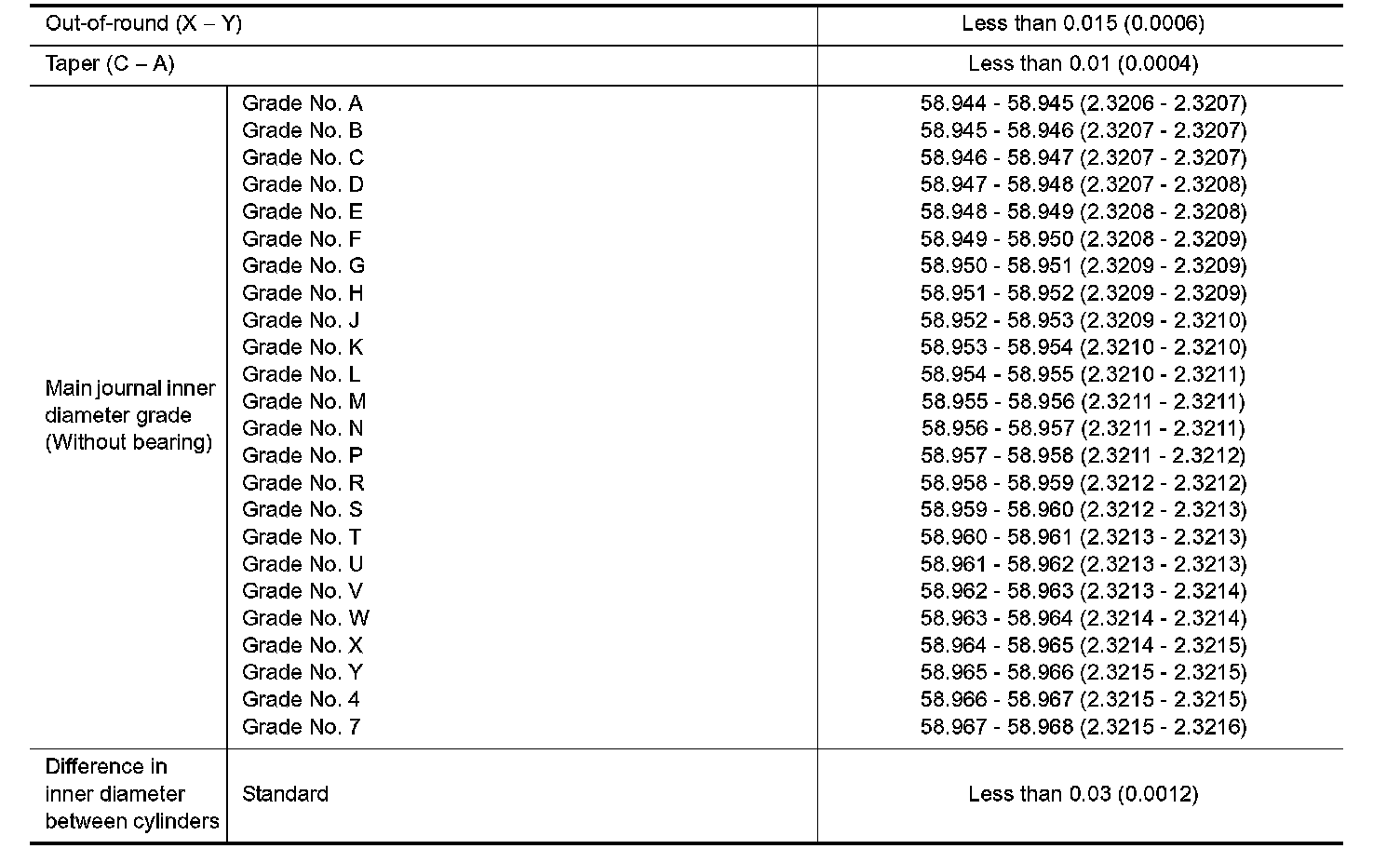 Grade No. 1: 88.980 - 88.990 mm (3.5031 - 3.5035 inch)