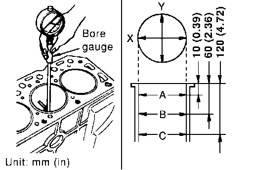 ^ Using a bore gauge, measure cylinder bore for wear, out-of-round and taper at 6 different points on each cylinder. (X and Y directions at A, B and C). The Y axis is in the longitudinal direction of the engine.