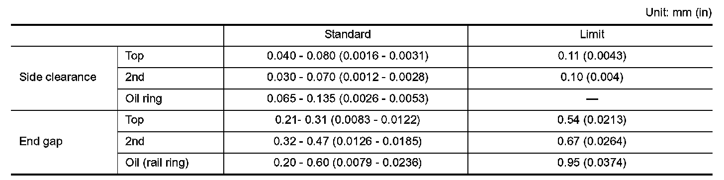 Oil ring: 0.20 - 0.60 mm (0.0079 - 0.0236 inch)