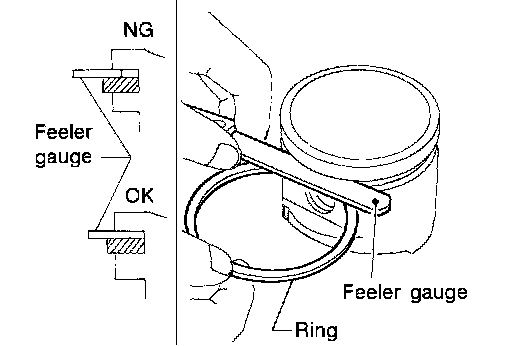 ^ Measure side clearance of piston ring and piston ring groove with feeler gauge.