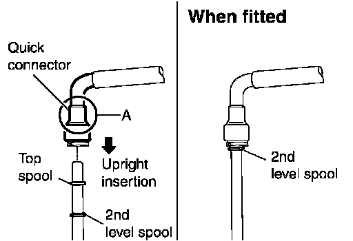 ^ Insert fuel tube into quick connector until the top spool on fuel tubes is inserted completely and the second level spool is positioned slightly below the quick connector bottom end.
