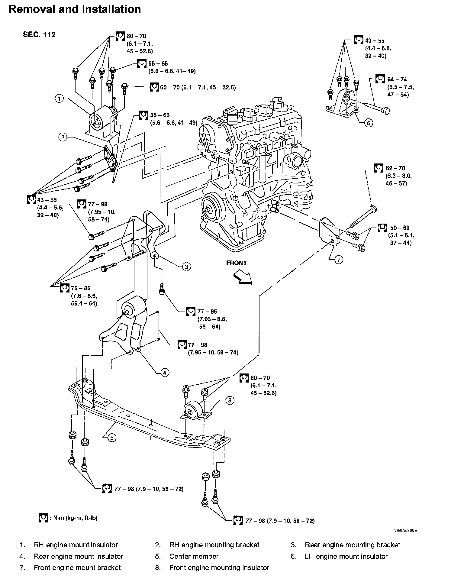 ^ Remove front and rear engine mounting insulator through-bolt and the center member bolts.