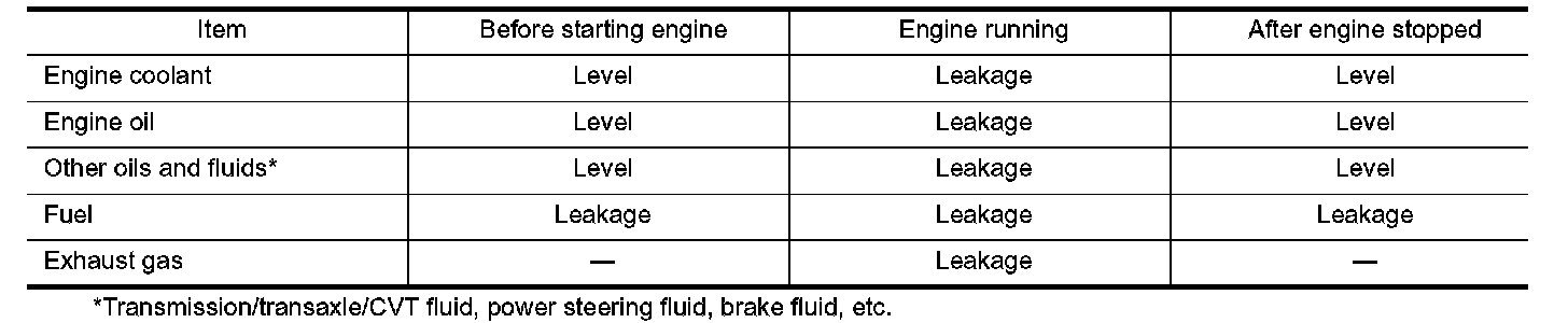 ^ Warm up engine thoroughly to make sure there is no leakage of fuel, exhaust gas, or any oils/fluids including engine oil and engine coolant.