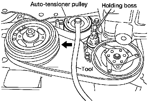 2. While securely holding the hexagonal part in pulley center of drive belt auto-tensioner, move in the direction of arrow (loosening direction of tensioner) using Tool.