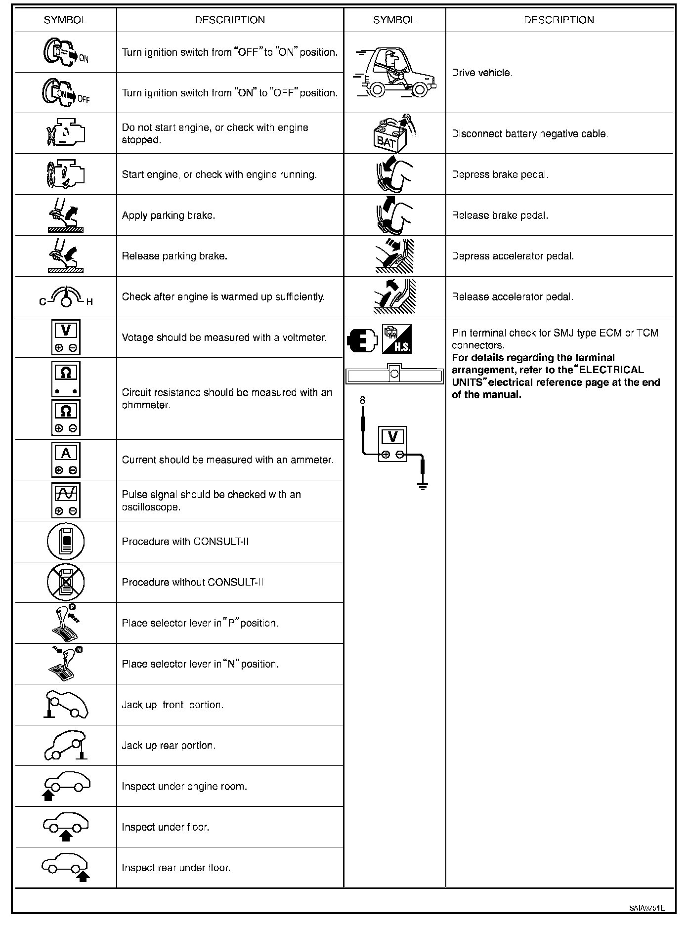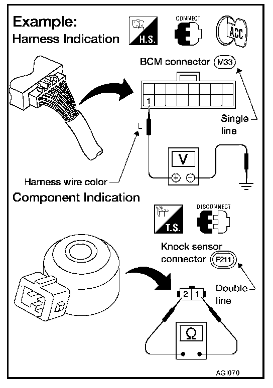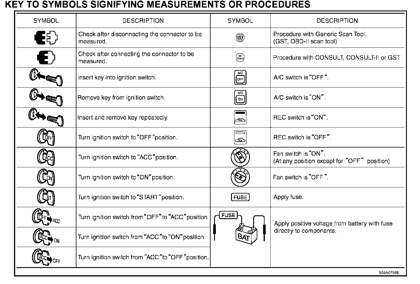 Symbols included in illustrations refer to measurements or procedures. Before diagnosing a problem, familiarize yourself with each symbol. Refer to "Connector Symbols" in GI Section and "KEY TO SYMBOLS SIGNIFYING MEASUREMENTS OR PROCEDURES".