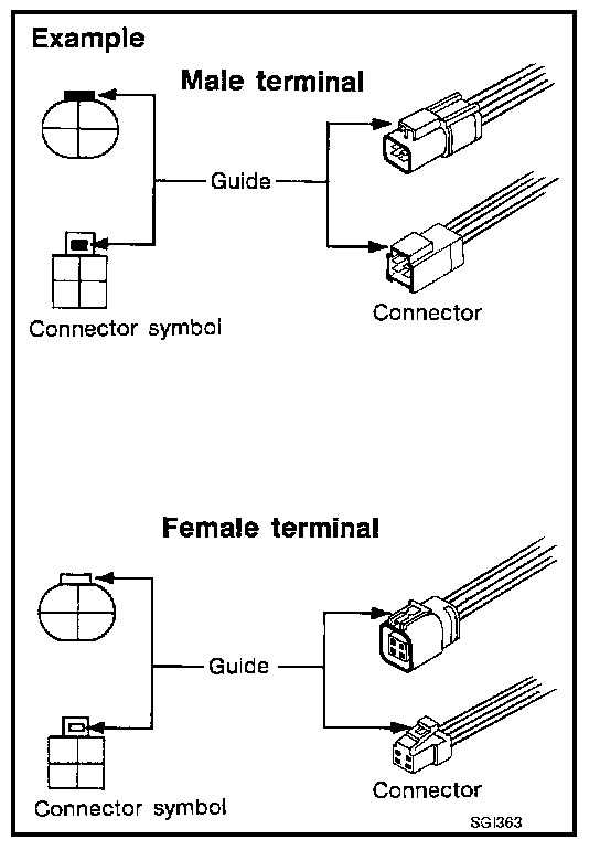 Connector guides for male terminals are shown in black and female terminals in white in wiring diagrams.