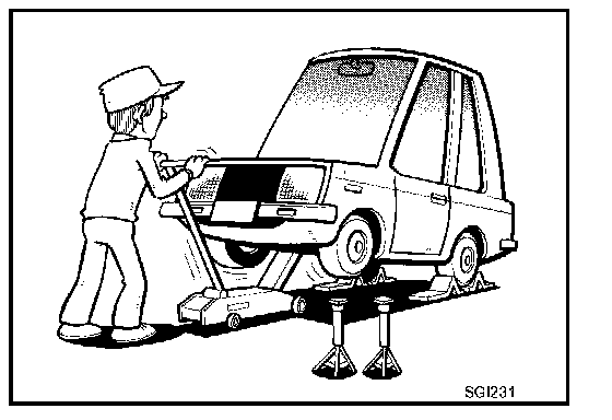- Before jacking up the vehicle, apply wheel chocks or other tire blocks to the wheels to prevent the vehicle from moving. After jacking up the vehicle, support the vehicle weight with safety stands at the points designated for proper lifting before working on the vehicle.