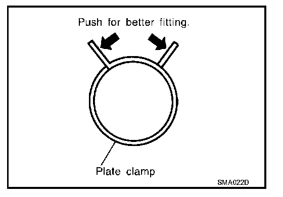 - After installing plate clamps, apply force to them in the direction of the arrow, tightening rubber hose equally all around.
